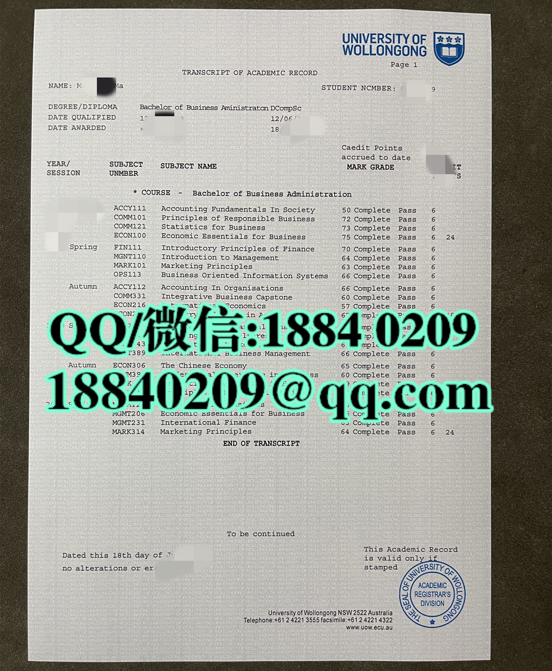 澳洲卧龙岗大学硕士,伍伦贡大学本科成绩单University of Wollongong transcript