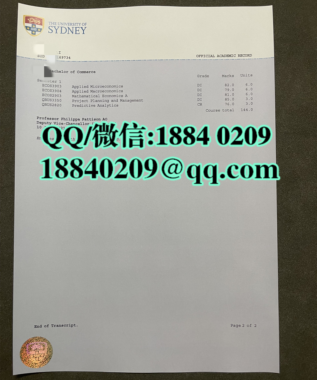 悉尼大学成绩单防伪样式,The University of Sydney transcript
