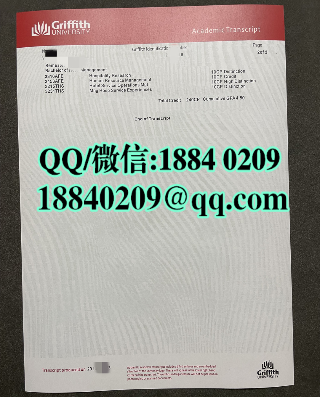 澳洲格里菲斯大学酒店管理成绩单专业成绩单,Griffith University Hospitality management transcript
