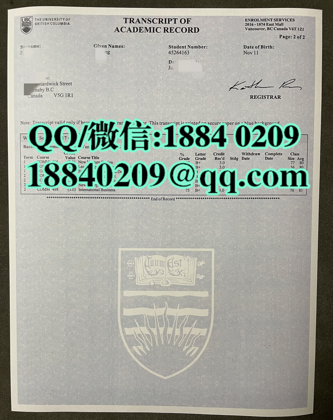 加拿大UBC大学成绩单,University of British Columbia transcript